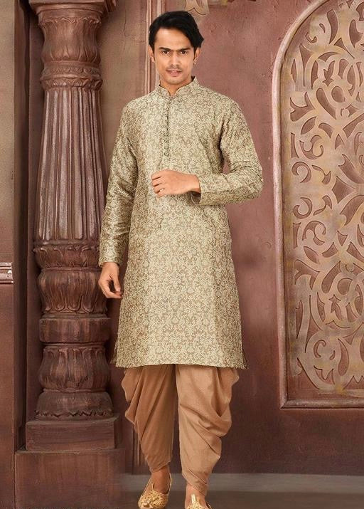 Redefine ethnic sophistication with the Elegant Jacquard Kurta Dhoti Set for Men. Crafted with luxurious Jacquard fabric and complemented by a smooth Art Silk–Cotton Silk dhoti, this ensemble blends traditional charm with modern finesse.